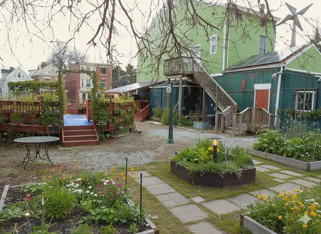 The fenced outdoor courtyard includes a covered patio and several square feet of greenspace that could be converted to raised beds and used for beehives, composting, and other permaculture activities.